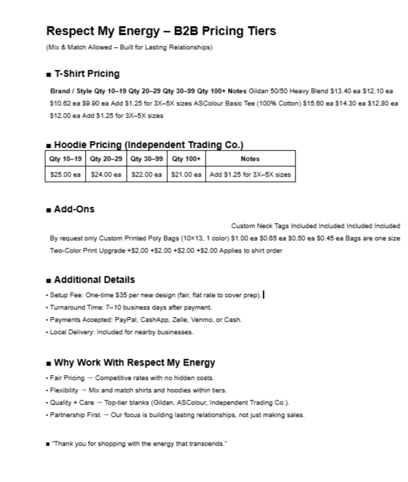 At Respect My Energy Print Co., we specialize in high-quality bulk printing for schools, churches, small businesses, and organizations across Michigan and Ohio. From custom t-shirts to hoodies and event apparel and custom poly bags for your shipping needs, we bring your brand to life with precision, consistency, and care. Our mission is to build lasting relationships through fair pricing, fast turnaround times, and energy that respects your vision.